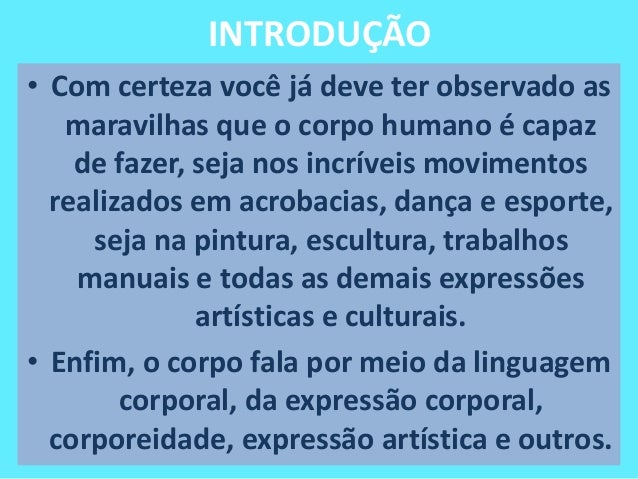 2. 2. INTRODUÇÃO • Com certeza você já deve ter observado as maravilhas que o corpo humano é capaz de fazer, seja nos incríveis movimentos realizados em acrobacias, dança e esporte, seja na pintura, escultura, trabalhos manuais e todas as demais expressões artísticas e culturais. • Enfim, o corpo fala por meio da linguagem corporal, da expressão corporal, corporeidade, expressão artística e outros.