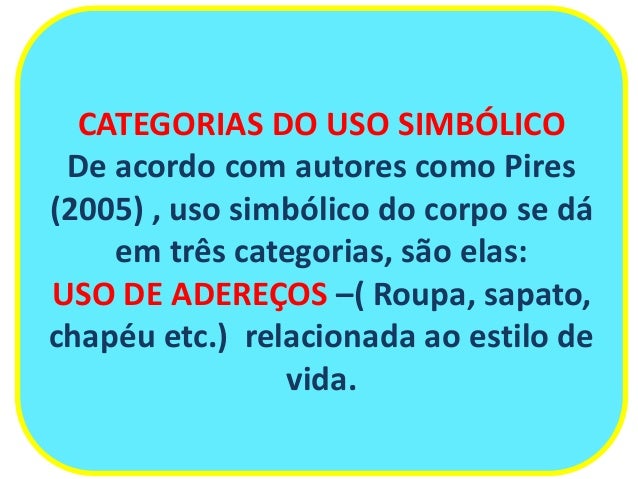 29. 29. CATEGORIAS DO USO SIMBÓLICO De acordo com autores como Pires (2005) , uso simbólico do corpo se dá em três categorias, são elas: USO DE ADEREÇOS –( Roupa, sapato, chapéu etc.) relacionada ao estilo de vida.