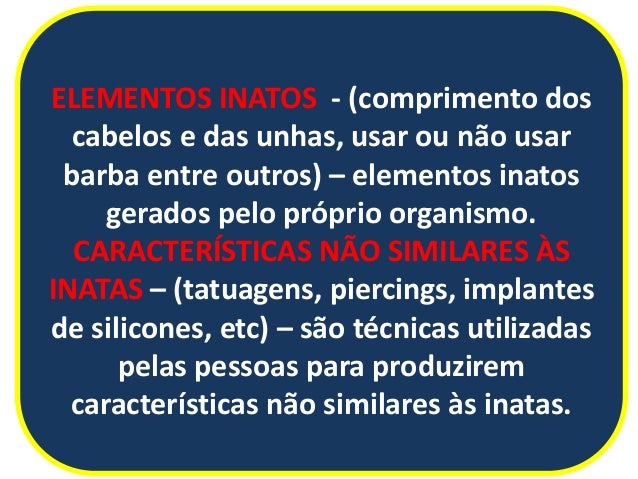 30. 30. ELEMENTOS INATOS - (comprimento dos cabelos e das unhas, usar ou não usar barba entre outros) – elementos inatos gerados pelo próprio organismo. CARACTERÍSTICAS NÃO SIMILARES ÀS INATAS – (tatuagens, piercings, implantes de silicones, etc) – são técnicas utilizadas pelas pessoas para produzirem características não similares às inatas.