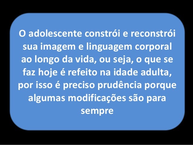 31. 31. O adolescente constrói e reconstrói sua imagem e linguagem corporal ao longo da vida, ou seja, o que se faz hoje é refeito na idade adulta, por isso é preciso prudência porque algumas modificações são para sempre