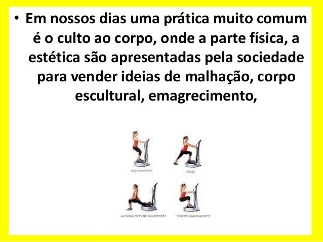 32. 32. • Em nossos dias uma prática muito comum é o culto ao corpo, onde a parte física, a estética são apresentadas pela sociedade para vender ideias de malhação, corpo escultural, emagrecimento,