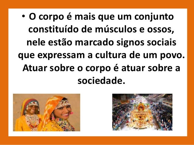 34. 34. • O corpo é mais que um conjunto constituído de músculos e ossos, nele estão marcado signos sociais que expressam a cultura de um povo. Atuar sobre o corpo é atuar sobre a sociedade.