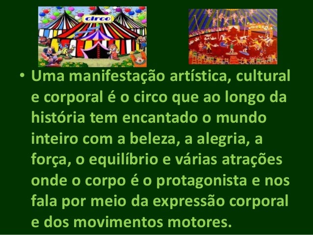 37. 37. • Uma manifestação artística, cultural e corporal é o circo que ao longo da história tem encantado o mundo inteiro com a beleza, a alegria, a força, o equilíbrio e várias atrações onde o corpo é o protagonista e nos fala por meio da expressão corporal e dos movimentos motores.