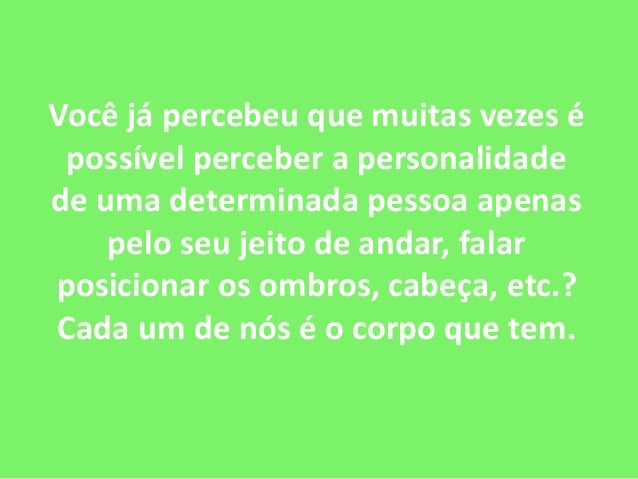 3. 3. Você já percebeu que muitas vezes é possível perceber a personalidade de uma determinada pessoa apenas pelo seu jeito de andar, falar posicionar os ombros, cabeça, etc.? Cada um de nós é o corpo que tem.