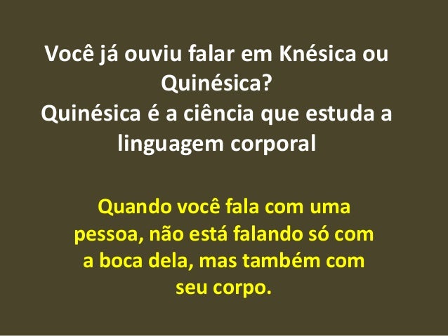 8. 8. Você já ouviu falar em Knésica ou Quinésica? Quinésica é a ciência que estuda a linguagem corporal Quando você fala com uma pessoa, não está falando só com a boca dela, mas também com seu corpo.