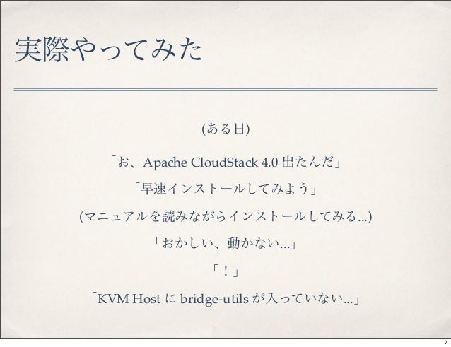 15. 15. 実際やってみた (ある日) 「お、Apache CloudStack 4.0 出たんだ」 「早速インストールしてみよう」 (マニュアルを読みながらインストールしてみる...) 「おかしい、動かない...」 「!」 「KVM Host に bridge-utils が入っていない...」 7