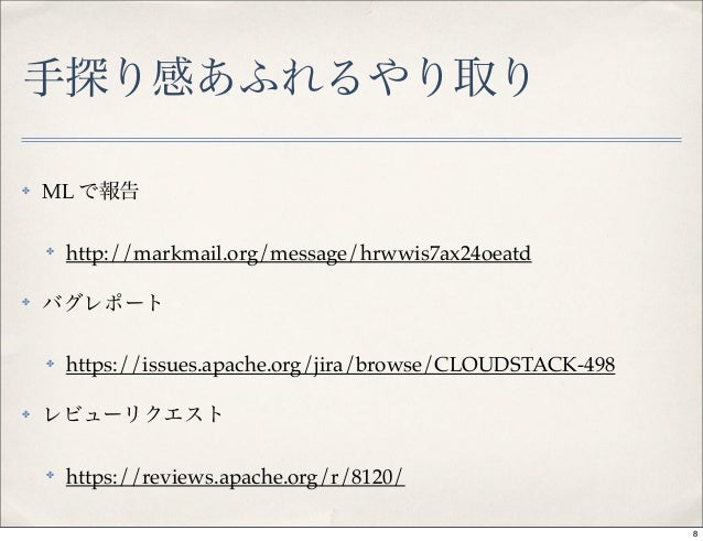16. 16. 手探り感あふれるやり取り✤ ML で報告 ✤ http://markmail.org/message/hrwwis7ax24oeatd✤ バグレポート ✤ https://issues.apache.org/jira/browse/CLOUDSTACK-498✤ レビューリクエスト ✤ https://reviews.apache.org/r/8120/ 8