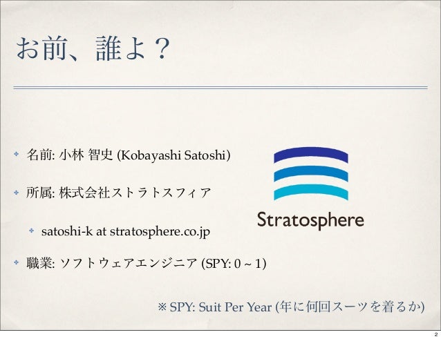2. 2. お前、誰よ?✤ 名前: 小林 智史 (Kobayashi Satoshi)✤ 所属: 株式会社ストラトスフィア ✤ satoshi-k at stratosphere.co.jp✤ 職業: ソフトウェアエンジニア (SPY: 0 ~ 1) ※ SPY: Suit Per Year (年に何回スーツを着るか) 2