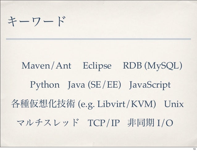 27. 27. キーワード Maven/Ant Eclipse RDB (MySQL) Python Java (SE/EE) JavaScript各種仮想化技術 (e.g. Libvirt/KVM) Unixマルチスレッド TCP/IP 非同期 I/O 13