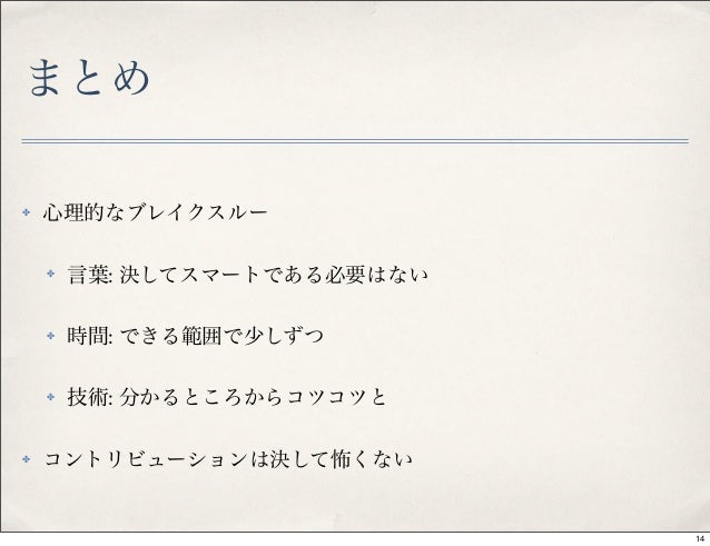 28. 28. まとめ✤ 心理的なブレイクスルー ✤ 言葉: 決してスマートである必要はない ✤ 時間: できる範囲で少しずつ ✤ 技術: 分かるところからコツコツと✤ コントリビューションは決して怖くない 14