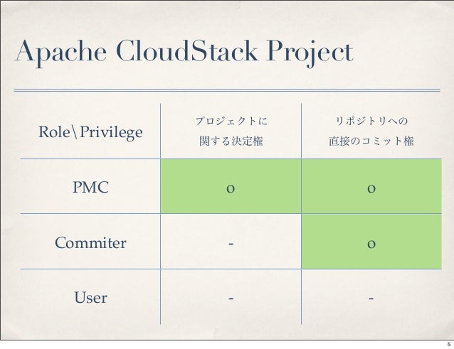 9. 9. Apache CloudStack Project プロジェクトに リポジトリへの RolePrivilege 関する決定権 直接のコミット権 PMC o o Commiter - o User - - 5