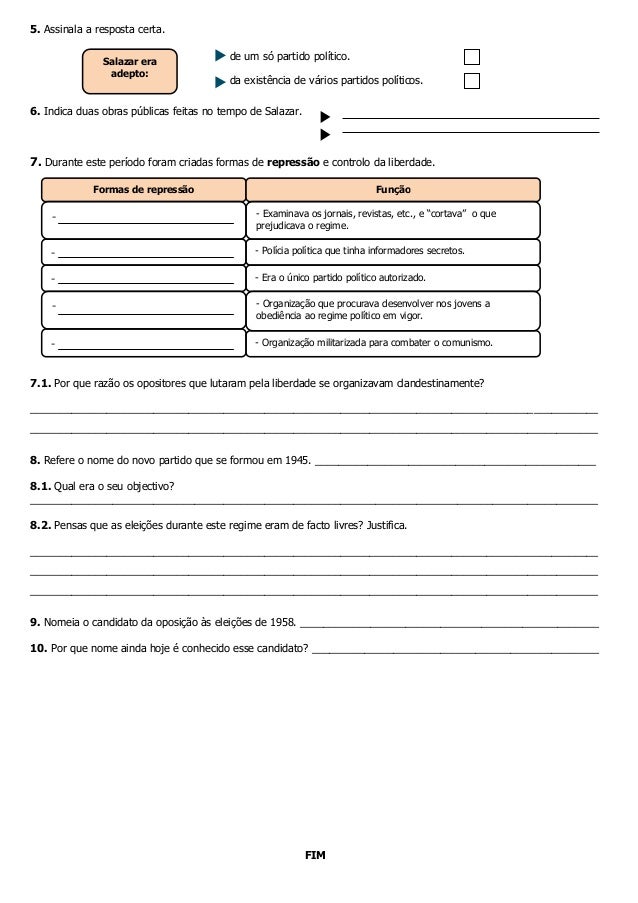 2. 2. 5. Assinala a resposta certa. Salazar era de um só partido político. adepto: da existência de vários partidos políticos.6. Indica duas obras públicas feitas no tempo de Salazar.7. Durante este período foram criadas formas de repressão e controlo da liberdade. Formas de repressão Função - - Examinava os jornais, revistas, etc., e “cortava” o que prejudicava o regime. - - Polícia política que tinha informadores secretos. - - Era o único partido político autorizado. - - Organização que procurava desenvolver nos jovens a obediência ao regime político em vigor. - - Organização militarizada para combater o comunismo.7.1. Por que razão os opositores que lutaram pela liberdade se organizavam clandestinamente?__________________________________________________________________________________________________________________________________________________________________________________________________8. Refere o nome do novo partido que se formou em 1945. ________________________________________________8.1. Qual era o seu objectivo?_________________________________________________________________________________________________8.2. Pensas que as eleições durante este regime eram de facto livres? Justifica.___________________________________________________________________________________________________________________________________________________________________________________________________________________________________________________________________________________________________9. Nomeia o candidato da oposição às eleições de 1958. ___________________________________________________10. Por que nome ainda hoje é conhecido esse candidato? _________________________________________________ FIM
