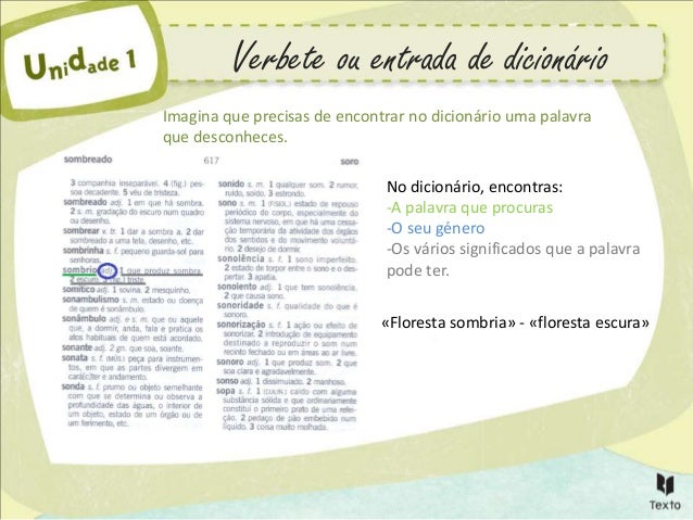 6. 6. Verbete ou entrada de dicionário Imagina que precisas de encontrar no dicionário uma palavra que desconheces. No dicionário, encontras: -A palavra que procuras -O seu género -Os vários significados que a palavra pode ter. «Floresta sombria» - «floresta escura»