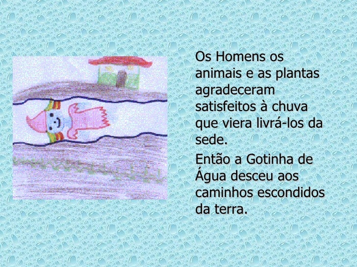 4. 4. <ul><li>Os Homens os animais e as plantas agradeceram satisfeitos à chuva que viera livrá-los da sede. </li></ul><ul><li>Então a Gotinha de Água desceu aos caminhos escondidos da terra. </li></ul>