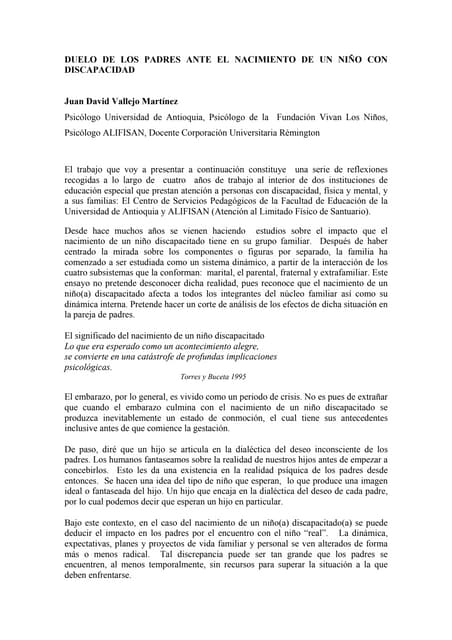 18. 18. 1. 8 ¿Cuáles son las reacciones normales de los Esperanza: Gradualmente, y aunque en un comienzo no padres y las madres cuando se dan cuenta parezca posible, van surgiendo nuevos pensamientos, que su niño o niña presenta autismo? nuevas sensaciones, nuevas esperanzas. Emprender acciones que favorecen el desarrollo del niño o la niña, aprender Toda pareja antes de que su hijo o hija nazca, ha soñado sobre el tema, estar en contacto con otros y muchas otras con tener un bebé sano. Por tanto, reconocer cualquier estrategias que se verán en el Capítulo 4, van dando paso diferencia en un hijo o hija no es nada fácil. Cuando no a la esperanza, a alegrarse con sus logros, a considerarlo se vive esta circunstancia es fácil decir “tranquilo, todo primero como un niño o una niña, y a aceptar la realidad sin saldrá bien”, o “con llorar no se soluciona nada”. Todos angustia. Pueden darse altibajos, lo cual también es normal. los que han afrontado tener un hijo o hija con autismo u otra condición diferente, saben que ha sido un proceso 1. 9 ¿Cuáles son las reacciones normales largo de aceptación y que lo común es manifestar de las maestras jardineras cuando se diferentes reacciones. Cada persona lo vive a su manera y dan cuenta que uno de sus alumnos no se le puede juzgar por ello. Los sentimientos que más presenta autismo? reportan, son: Negación: Es común que inicialmente no quieran aceptar la realidad de un hijo o hija con diferencias. Pueden ir de profesional en profesional buscando alguien que los tranquilice. Rabia: “Yo pelié con todos, hasta con Dios” , “Por qué a mí?” Estas frases las expresó un padre al referir lo que sintió al comienzo. Culpa: Muchas veces se experimenta culpabilidad y se cuestionan situaciones por la que pasaron durante el embarazo, el parto y después del nacimiento. Al igual que los padres, las jardineras y maestros esperan Depresión: Cada persona expresa de una manera tener un grupo de niños o niñas cariñosos, tranquilos, diferente la tristeza. Algunos presentan reacciones independientes e inteligentes. Esto les permitiría realizar las depresivas, iguales a las que se experimentan en cualquier actividades cotidianas con facilidad y agrado. La llegada de situación de duelo: deseos de llorar, indiferencia, sentir un niño o niña con autismo, genera diferentes sentimientos y que “se vino el mundo encima”¸ desmotivación por las reacciones. Entre ellos: actividades cotidianas, desorganización del sueño, la alimentación, deseos de aislarse. Temor: Se preguntan cómo le pueden enseñar, como le deben hablar, que harán si el niño llora o se enoja. Sienten Soledad: “Uno siente que es el único en el mundo al que que es algo desconocido, es un tema en el que no han le pasa esto”. Aunque se tenga una pareja, es frecuente sido formados y por tanto, no están seguros de poder que se sienta solo o sola con sus sentimientos. satisfacer sus necesidades. 17