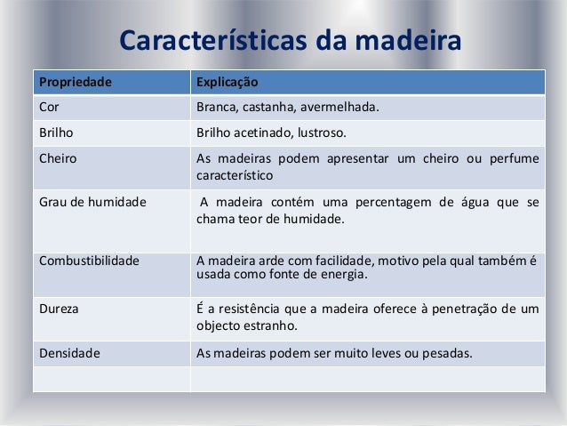 22. 22. Características da madeira Propriedade Explicação Cor Branca, castanha, avermelhada. Brilho Brilho acetinado, lustroso. Cheiro As madeiras podem apresentar um cheiro ou perfume característico Grau de humidade A madeira contém uma percentagem de água que se chama teor de humidade. Combustibilidade A madeira arde com facilidade, motivo pela qual também é usada como fonte de energia. Dureza É a resistência que a madeira oferece à penetração de um objecto estranho. Densidade As madeiras podem ser muito leves ou pesadas.