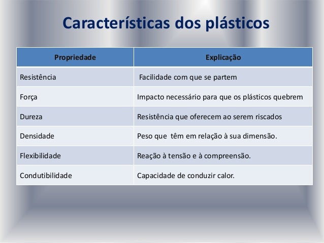 24. 24. Características dos plásticos Propriedade Explicação Resistência Facilidade com que se partem Força Impacto necessário para que os plásticos quebrem Dureza Resistência que oferecem ao serem riscados Densidade Peso que têm em relação à sua dimensão. Flexibilidade Reação à tensão e à compreensão. Condutibilidade Capacidade de conduzir calor.