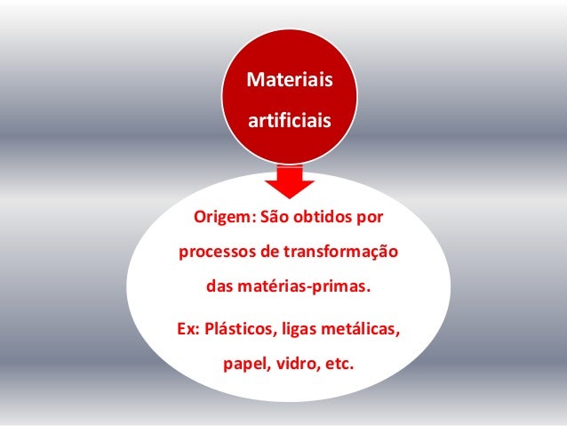 4. 4. Origem: São obtidos por processos de transformação das matérias-primas. Ex: Plásticos, ligas metálicas, papel, vidro, etc. Materiais artificiais