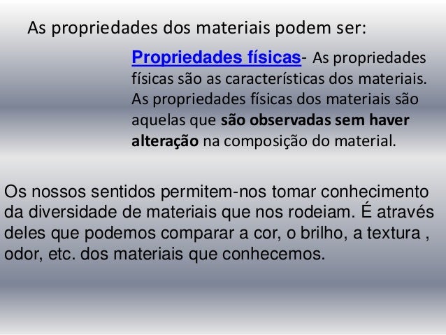 8. 8. As propriedades dos materiais podem ser: Propriedades físicas- As propriedades físicas são as características dos materiais. As propriedades físicas dos materiais são aquelas que são observadas sem haver alteração na composição do material. Os nossos sentidos permitem-nos tomar conhecimento da diversidade de materiais que nos rodeiam. É através deles que podemos comparar a cor, o brilho, a textura , odor, etc. dos materiais que conhecemos.