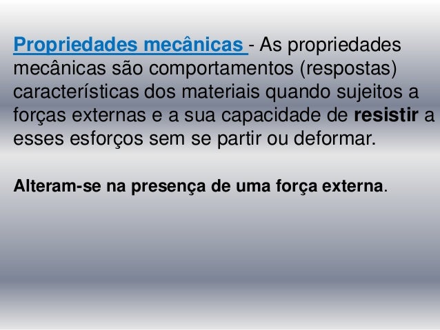 9. 9. Propriedades mecânicas - As propriedades mecânicas são comportamentos (respostas) características dos materiais quando sujeitos a forças externas e a sua capacidade de resistir a esses esforços sem se partir ou deformar. Alteram-se na presença de uma força externa.