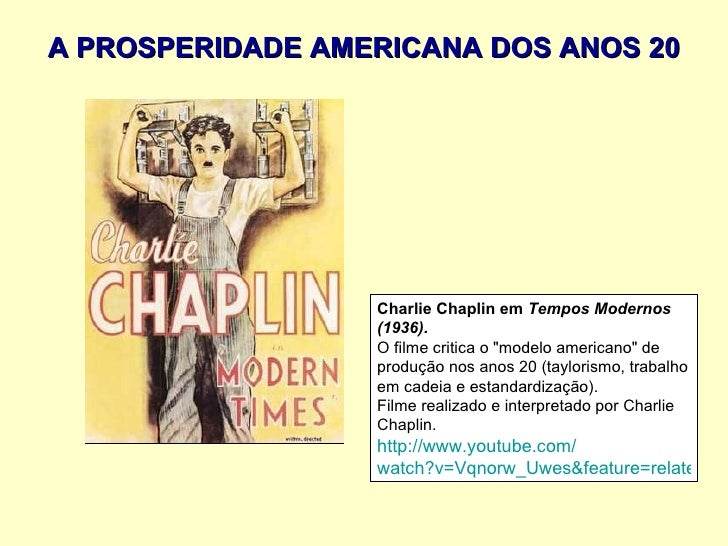 2. 2. A PROSPERIDADE AMERICANA DOS ANOS 20 Charlie Chaplin em Tempos Modernos (1936). O filme critica o "modelo americano" de produção nos anos 20 (taylorismo, trabalho em cadeia e estandardização). Filme realizado e interpretado por Charlie Chaplin. http:// www.youtube.com / watch?v=Vqnorw_Uwes&feature=related