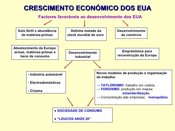 3. 3. CRESCIMENTO ECONÓMICO DOS EUA Factores favoráveis ao desenvolvimento dos EUA Solo fértil e abundância de matérias-primas Detinha metade do stock mundial de ouro Desenvolvimento do comércio Abastecimento da Europa: armas, matérias-primas e bens de consumo Desenvolvimento industrial Empréstimos para reconstrução da Europa <ul><li>- Indústria automóvel </li></ul><ul><li>Electrodomésticos </li></ul><ul><li>- Cinema </li></ul>Novos modelos de produção e organização do trabalho : -> TAYLORISMO : trabalho em cadeia. -> FORDISMO : produção em massa; estandardização . -> Concentração das empresas: monopólios. ● SOCIEDADE DE CONSUMO ● “ LOUCOS ANOS 20”