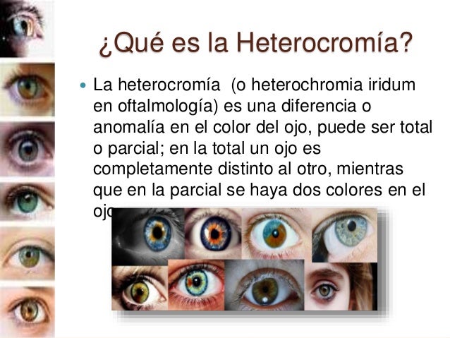 2. 2. ¿Qué es la Heterocromía?  La heterocromía (o heterochromia iridum en oftalmología) es una diferencia o anomalía en el color del ojo, puede ser total o parcial; en la total un ojo es completamente distinto al otro, mientras que en la parcial se haya dos colores en el ojo.
