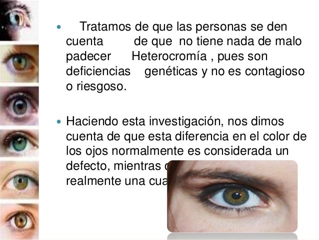 4. 4.  Tratamos de que las personas se den cuenta de que no tiene nada de malo padecer Heterocromía , pues son deficiencias genéticas y no es contagioso o riesgoso.  Haciendo esta investigación, nos dimos cuenta de que esta diferencia en el color de los ojos normalmente es considerada un defecto, mientras que para nosotras es realmente una cualidad.