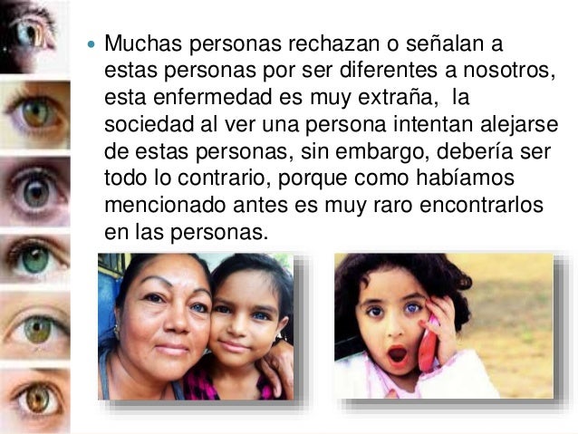 5. 5.  Muchas personas rechazan o señalan a estas personas por ser diferentes a nosotros, esta enfermedad es muy extraña, la sociedad al ver una persona intentan alejarse de estas personas, sin embargo, debería ser todo lo contrario, porque como habíamos mencionado antes es muy raro encontrarlos en las personas.
