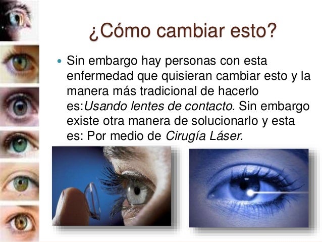 7. 7. ¿Cómo cambiar esto?  Sin embargo hay personas con esta enfermedad que quisieran cambiar esto y la manera más tradicional de hacerlo es:Usando lentes de contacto. Sin embargo existe otra manera de solucionarlo y esta es: Por medio de Cirugía Láser.