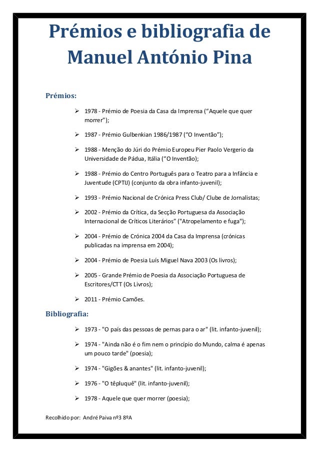 2. 2. Prémios e bibliografia de Manuel António PinaPrémios:  1978 - Prémio de Poesia da Casa da Imprensa (“Aquele que quer morrer”);  1987 - Prémio Gulbenkian 1986/1987 (“O Inventão”);  1988 - Menção do Júri do Prémio Europeu Pier Paolo Vergerio da Universidade de Pádua, Itália (“O Inventão);  1988 - Prémio do Centro Português para o Teatro para a Infância e Juventude (CPTIJ) (conjunto da obra infanto-juvenil);  1993 - Prémio Nacional de Crónica Press Club/ Clube de Jornalistas;  2002 - Prémio da Crítica, da Secção Portuguesa da Associação Internacional de Críticos Literários” ("Atropelamento e fuga");  2004 - Prémio de Crónica 2004 da Casa da Imprensa (crónicas publicadas na imprensa em 2004);  2004 - Prémio de Poesia Luís Miguel Nava 2003 (Os livros);  2005 - Grande Prémio de Poesia da Associação Portuguesa de Escritores/CTT (Os Livros);  2011 - Prémio Camões.Bibliografia:  1973 - "O país das pessoas de pernas para o ar" (lit. infanto-juvenil);  1974 - "Ainda não é o fim nem o princípio do Mundo, calma é apenas um pouco tarde" (poesia);  1974 - "Gigões & anantes" (lit. infanto-juvenil);  1976 - "O têpluquê" (lit. infanto-juvenil);  1978 - Aquele que quer morrer (poesia);Recolhido por: André Paiva nº3 8ºA