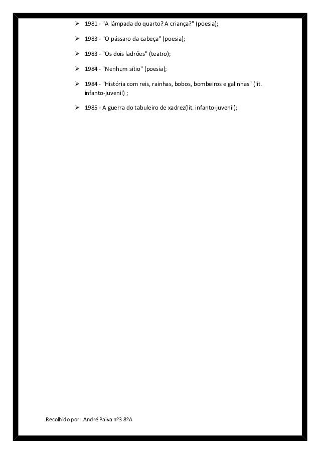 3. 3.  1981 - "A lâmpada do quarto? A criança?" (poesia);  1983 - "O pássaro da cabeça" (poesia);  1983 - "Os dois ladrões" (teatro);  1984 - "Nenhum sítio" (poesia);  1984 - "História com reis, rainhas, bobos, bombeiros e galinhas" (lit. infanto-juvenil) ;  1985 - A guerra do tabuleiro de xadrez(lit. infanto-juvenil);Recolhido por: André Paiva nº3 8ºA
