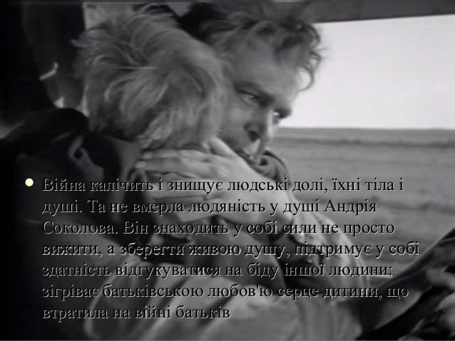 10. 10.  Війна калічить і знищує людські долі, їхні тіла іВійна калічить і знищує людські долі, їхні тіла і душі. Та не вмерла людяність у душі Андріядуші. Та не вмерла людяність у душі Андрія Соколова. Він знаходить у собі сили не простоСоколова. Він знаходить у собі сили не просто вижити, а зберегти живою душу, підтримує у собівижити, а зберегти живою душу, підтримує у собі здатність відгукуватися на біду іншої людини:здатність відгукуватися на біду іншої людини: зігріває батьківською любов'ю серце дитини, щозігріває батьківською любов'ю серце дитини, що втратила на війні батьківвтратила на війні батьків