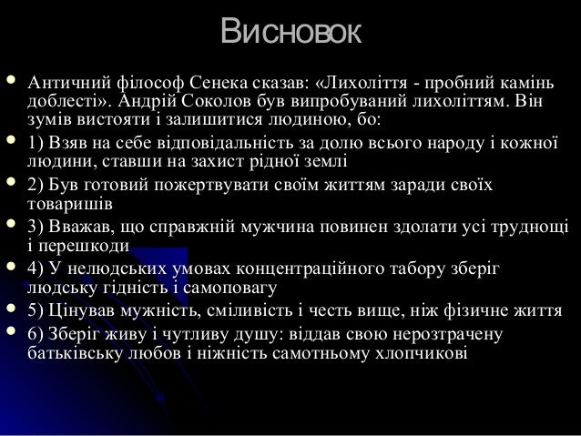 11. 11. ВисновокВисновок  Античний філософ Сенека сказав: «Лихоліття - пробний каміньАнтичний філософ Сенека сказав: «Лихоліття - пробний камінь доблесті». Андрій Соколов був випробуваний лихоліттям. Віндоблесті». Андрій Соколов був випробуваний лихоліттям. Він зумів вистояти і залишитися людиною, бо:зумів вистояти і залишитися людиною, бо:  1) Взяв на себе відповідальність за долю всього народу і кожної1) Взяв на себе відповідальність за долю всього народу і кожної людини, ставши на захист рідної землілюдини, ставши на захист рідної землі  2) Був готовий пожертвувати своїм життям заради своїх2) Був готовий пожертвувати своїм життям заради своїх товаришівтоваришів  3) Вважав, що справжній мужчина повинен здолати усі труднощі3) Вважав, що справжній мужчина повинен здолати усі труднощі і перешкодиі перешкоди  4) У нелюдських умовах концентраційного табору зберіг4) У нелюдських умовах концентраційного табору зберіг людську гідність і самоповагулюдську гідність і самоповагу  5) Цінував мужність, сміливість і честь вище, ніж фізичне життя5) Цінував мужність, сміливість і честь вище, ніж фізичне життя  6) Зберіг живу і чутливу душу: віддав свою нерозтрачену6) Зберіг живу і чутливу душу: віддав свою нерозтрачену батьківську любов і ніжність самотньому хлопчиковібатьківську любов і ніжність самотньому хлопчикові