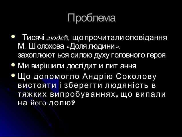 2. 2. ПроблемаПроблема  ТисячіТисячі люделюдейй, щопрочитали оповідання, щопрочитали оповідання . « »,М Шолохова Доля людини. « »,М Шолохова Доля людини .захоплюют ься силою духу головного героя.захоплюют ься силою духу головного героя  Ми вирішили дослідит и пит анняМи вирішили дослідит и пит ання  Що допомогло Андрію СоколовуЩо допомогло Андрію Соколову вистояти і зберегти людяність ввистояти і зберегти людяність в ,тяжких випробуваннях що випали,тяжких випробуваннях що випали нана йогойого ?долю?долю