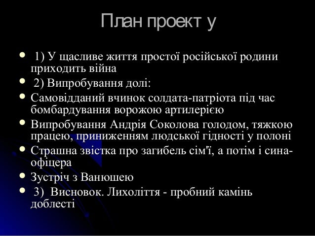3. 3. План проект уПлан проект у  1)1) У щасливе життя простої російської родиниУ щасливе життя простої російської родини приходить війнаприходить війна  2)2) Випробування долі:Випробування долі:  Самовідданий вчинок солдата-патріота під часСамовідданий вчинок солдата-патріота під час бомбардування ворожою артилерієюбомбардування ворожою артилерією  Випробування Андрія Соколова голодом, тяжкоюВипробування Андрія Соколова голодом, тяжкою працею, приниженням людської гідності у полоніпрацею, приниженням людської гідності у полоні  Страшна звістка про загибель сім'їСтрашна звістка про загибель сім'ї,, а потім і сина-а потім і сина- офіцераофіцера  Зустріч зЗустріч з ВанюшеюВанюшею  3)3) Висновок. ЛихоліттяВисновок. Лихоліття -- пробний каміньпробний камінь доблестідоблесті