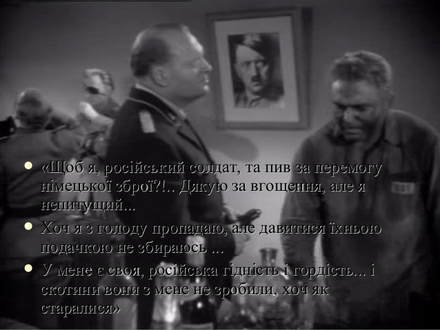 8. 8.  «Щоб я, російський солдат, та пив за перемогу«Щоб я, російський солдат, та пив за перемогу німецької зброї?німецької зброї?!..!.. Дякую за вгощення, але яДякую за вгощення, але я непитущий...непитущий...  Хоч я з голоду пропадаю, але давитися їхньоюХоч я з голоду пропадаю, але давитися їхньою подачкою не збираюсьподачкою не збираюсь ......  У мене є свояУ мене є своя,, російська гідність і гордість... іросійська гідність і гордість... і скотини вони з мене не зробили, хоч якскотини вони з мене не зробили, хоч як старалися»старалися»