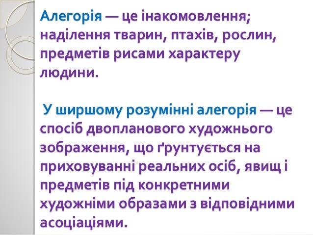 10. 10. Алегорія — це інакомовлення; наділення тварин, птахів, рослин, предметів рисами характеру людини. У ширшому розумінні алегорія — це спосіб двопланового художнього зображення, що ґрунтується на приховуванні реальних осіб, явищ і предметів під конкретними художніми образами з відповідними асоціаціями.