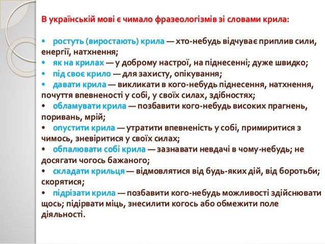 11. 11. В українській мові є чимало фразеологізмів зі словами крила: • ростуть (виростають) крила — хто-небудь відчуває приплив сили, енергії, натхнення; • як на крилах — у доброму настрої, на піднесенні; дуже швидко; • під своє крило — для захисту, опікування; • давати крила — викликати в кого-небудь піднесення, натхнення, почуття впевненості у собі, у своїх силах, здібностях; • обламувати крила — позбавити кого-небудь високих прагнень, поривань, мрій; • опустити крила — утратити впевненість у собі, примиритися з чимось, зневіритися у своїх силах; • обпалювати собі крила — зазнавати невдачі в чому-небудь; не досягати чогось бажаного; • складати крильця — відмовлятися від будь-яких дій, від боротьби; скорятися; • підрізати крила — позбавити кого-небудь можливості здійснювати щось; підірвати міць, знесилити когось або обмежити поле діяльності.