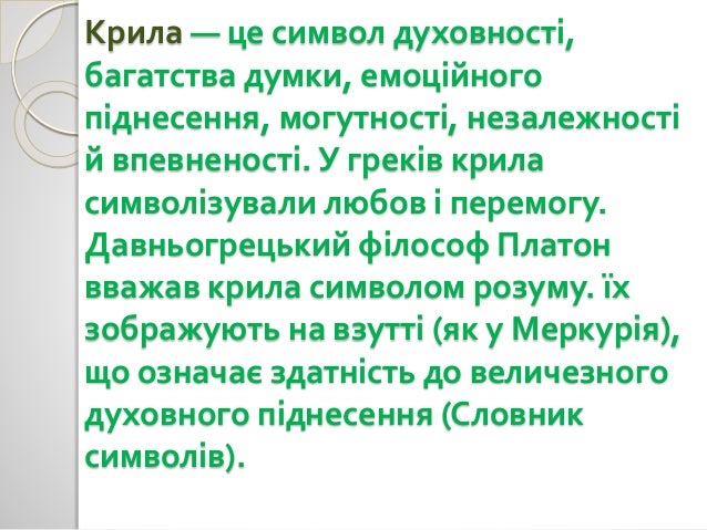 12. 12. Крила — це символ духовності, багатства думки, емоційного піднесення, могутності, незалежності й впевненості. У греків крила символізували любов і перемогу. Давньогрецький філософ Платон вважав крила символом розуму. їх зображують на взутті (як у Меркурія), що означає здатність до величезного духовного піднесення (Словник символів).