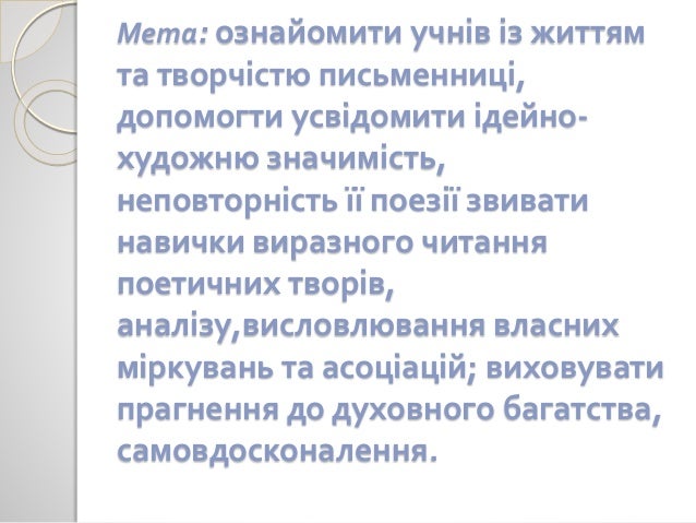 2. 2. Мета: ознайомити учнів із життям та творчістю письменниці, допомогти усвідомити ідейно- художню значимість, неповторність її поезії звивати навички виразного читання поетичних творів, аналізу,висловлювання власних міркувань та асоціацій; виховувати прагнення до духовного багатства, самовдосконалення.