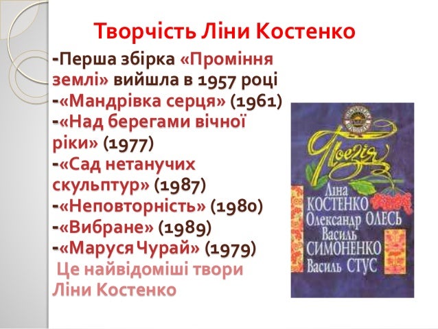 5. 5. -Перша збірка «Проміння землі» вийшла в 1957 році -«Мандрівка серця» (1961) -«Над берегами вічної ріки» (1977) -«Сад нетанучих скульптур» (1987) -«Неповторність» (1980) -«Вибране» (1989) -«МарусяЧурай» (1979) Це найвідоміші твори Ліни Костенко Творчість Ліни Костенко