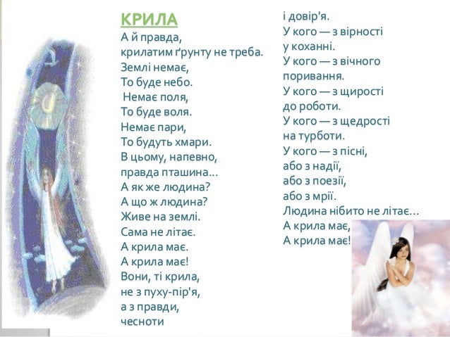 8. 8. КРИЛА А й правда, крилатим ґрунту не треба. Землі немає, То буде небо. Немає поля, То буде воля. Немає пари, То будуть хмари. В цьому, напевно, правда пташина... А як же людина? А що ж людина? Живе на землі. Сама не літає. А крила має. А крила має! Вони, ті крила, не з пуху-пір'я, а з правди, чесноти і довір'я. У кого — з вірності у коханні. У кого — з вічного поривання. У кого — з щирості до роботи. У кого — з щедрості на турботи. У кого — з пісні, або з надії, або з поезії, або з мрії. Людина нібито не літає... А крила має, А крила має!