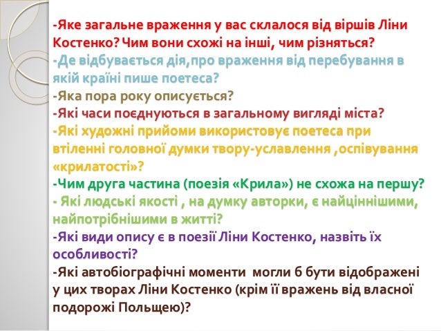 9. 9. -Яке загальне враження у вас склалося від віршів Ліни Костенко?Чим вони схожі на інші, чим різняться? -Де відбувається дія,про враження від перебування в якій країні пише поетеса? -Яка пора року описується? -Які часи поєднуються в загальному вигляді міста? -Які художні прийоми використовує поетеса при втіленні головної думки твору-уславлення ,оспівування «крилатості»? -Чим друга частина (поезія «Крила») не схожа на першу? - Які людські якості , на думку авторки, є найціннішими, найпотрібнішими в житті? -Які види опису є в поезії Ліни Костенко, назвіть їх особливості? -Які автобіографічні моменти могли б бути відображені у цих творах Ліни Костенко (крім її вражень від власної подорожі Польщею)?