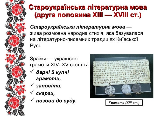 10. 10. Староукраїнська літературна моваСтароукраїнська літературна мова (друга половина ХІІІ — ХVІІІ ст.)(друга половина ХІІІ — ХVІІІ ст.) Староукраїнська літературна мова — жива розмовна народна стихія, яка базувалася на літературно-писемних традиціях Київської Русі. Грамота (ХІІІ ст.)Грамота (ХІІІ ст.) Зразки — українські грамоти ХІV–ХV століть:  дарчі й купчі грамоти,  заповіти,  скарги,  позови до суду.