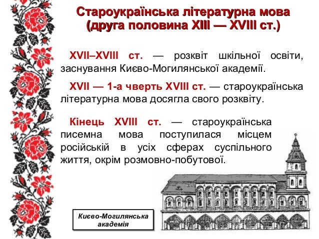 12. 12. Староукраїнська літературна моваСтароукраїнська літературна мова (друга половина ХІІІ — ХVІІІ ст.)(друга половина ХІІІ — ХVІІІ ст.) XVII–XVIII ст. — розквіт шкільної освіти, заснування Києво-Могилянської академії. XVII — 1-а чверть XVIII ст. — староукраїнська літературна мова досягла свого розквіту. Кінець XVIII ст. — староукраїнська писемна мова поступилася місцем російській в усіх сферах суспільного життя, окрім розмовно-побутової. Києво-Могилянська академія Києво-Могилянська академія