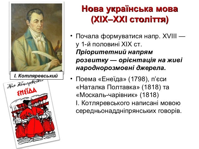 13. 13. Нова українська моваНова українська мова (XIX–XXI століття)(XIX–XXI століття) • Почала формуватися напр. XVIII — у 1-й половині XIX ст. Пріоритетний напрям розвитку — орієнтація на живі народнорозмовні джерела. • Поема «Енеїда» (1798), п’єси «Наталка Полтавка» (1818) та «Москаль-чарівник» (1818) І. Котляревського написані мовою середньонаддніпрянських говорів. І. Котляревський