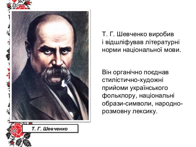 15. 15. Т. Г. Шевченко виробив і відшліфував літературні норми національної мови. Він органічно поєднав стилістично-художні прийоми українського фольклору, національні образи-символи, народно- розмовну лексику. Т. Г. ШевченкоТ. Г. Шевченко