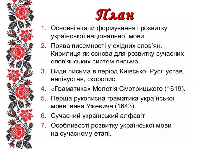 1. 1. ПланПлан 1. Основні етапи формування і розвитку української національної мови. 2. Поява писемності у східних слов’ян. Кирилиця як основа для розвитку сучасних слов’янських систем письма. 3. Види письма в період Київської Русі: устав, напівустав, скоропис. 4. «Граматика» Мелетія Смотрицького (1619). 5. Перша рукописна граматика української мови Івана Ужевича (1643). 6. Сучасний український алфавіт. 7. Особливості розвитку української мови на сучасному етапі.