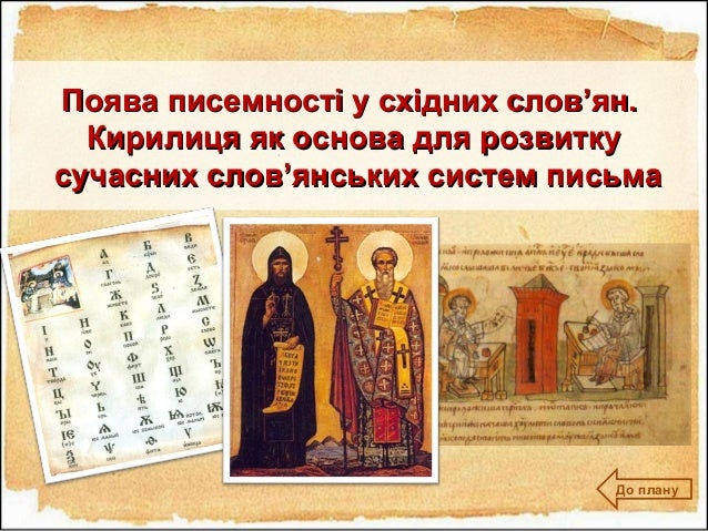 19. 19. Поява писемності у східних слов’ян.Поява писемності у східних слов’ян. Кирилиця як основа для розвиткуКирилиця як основа для розвитку сучасних слов’янських систем письмасучасних слов’янських систем письма До плану